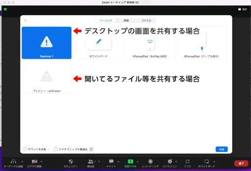 「画面共有ができる設定」に変更していない状態で画面共有しようとすると、下のような状態となり、画面共有できないです。